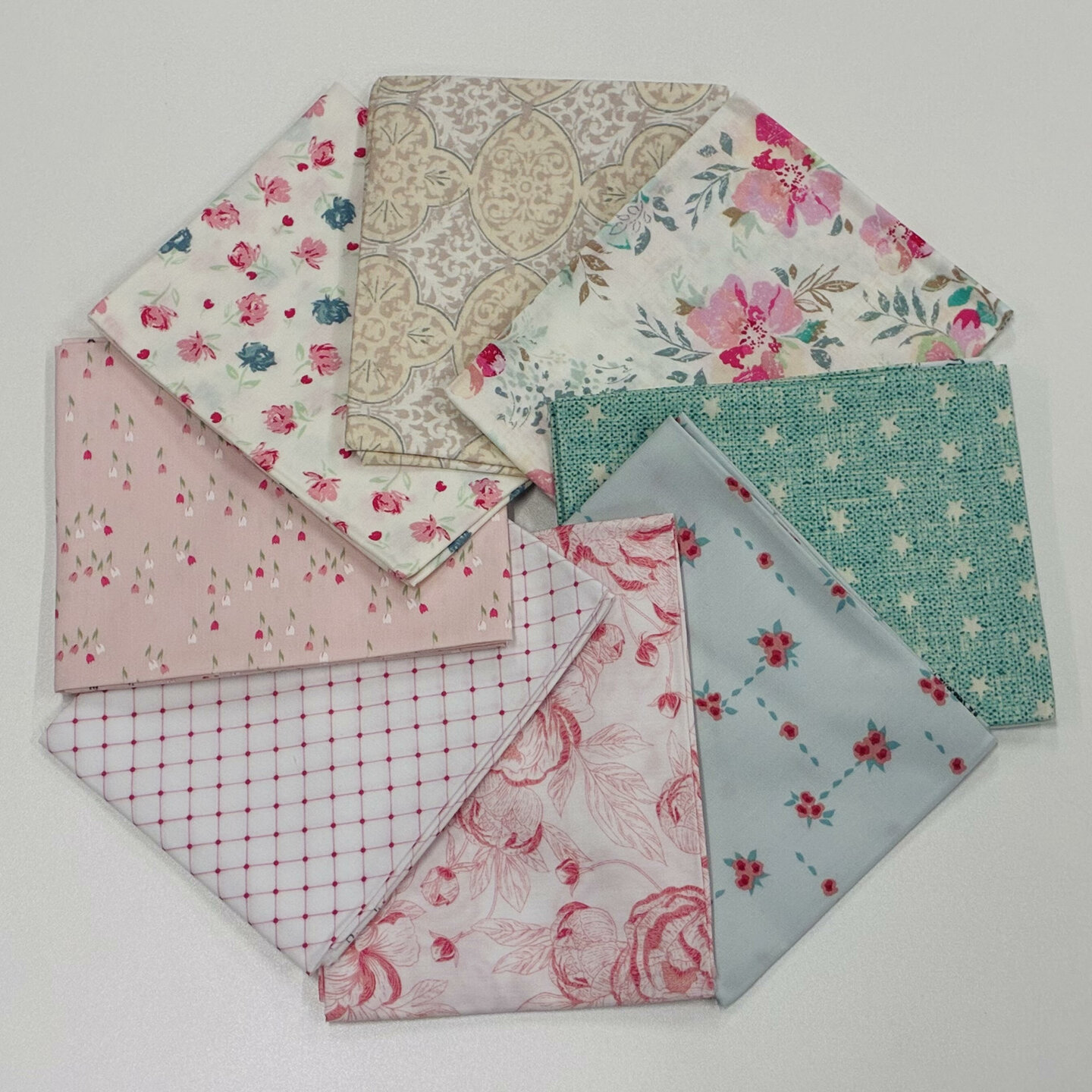 Balení obsahuje 8 fat quartrů (obdélníků 45 x 55cm) látek